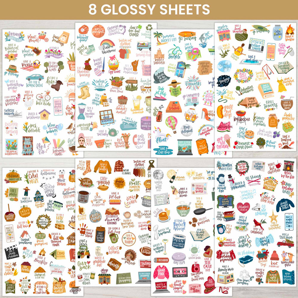 Seasonal Bucket Lists Planner Stickers Pack Showing Detail of Eight Glossy Sheets